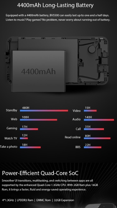 Смартфон Blackview BV5500 имееет Nano-SIM  2 SIM  экран: 5,5"  IPS  1440x720  встроенная память: 16 ГБ  оперативная память: 2 ГБ  процессор: Mediatek MT6580 + GPU Mali-400MP2  количество ядер: 4  ОС: Android 8.1 (Oreo)  аккумулятор: 4400 мАч (съемная)  камера: 8+8 Мп