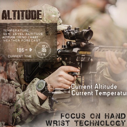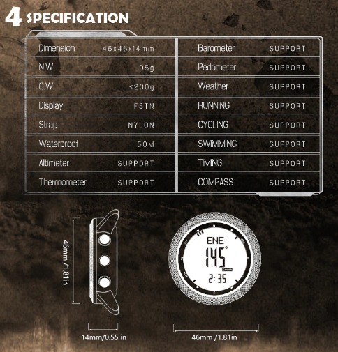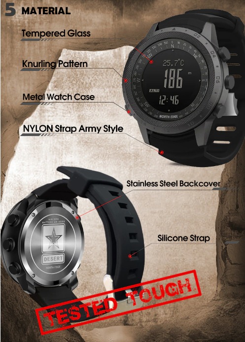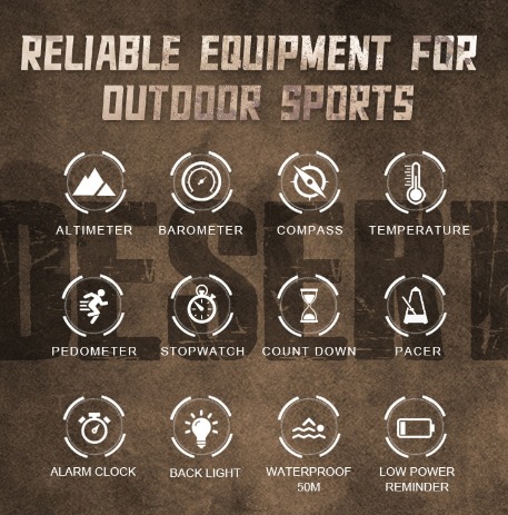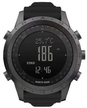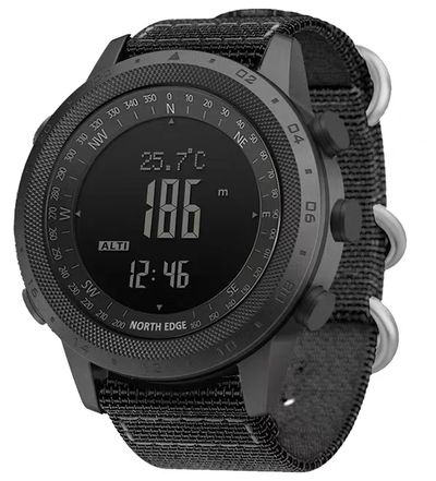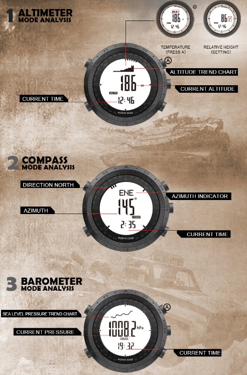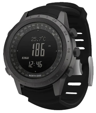 North Edge Desert 5BAR - це стильний чоловічий годинник з оригінальним дизайном, який оснащений безліччю додаткових функцій, які згодяться військовому або туристу. В даній моделі допустимі 2 режими будильника: класичний сигнал у встановлений час та щогодинний. Таймер зворотного відліку та секундомір стануть у пригоді для контролю послідовності події чи процесу. Слідкувати за тим, скільки Ви пересуваєтеся допоможе функція педометра, яка зберігає дані про те, скільки кроків Ви пройшли, яку відстань, скільки калорій витратили. Ви можете переглянути та порівняти інформацію за останніх сім днів. Режим компаса допомагає зорієнтуватися в незнайомій місцевості. Після первинного налаштування функції альтиметра та барометра годинник забезпечуватиме Вас інформацією про висоту, на якій ви знаходитесь, атмосферний тиск і температуру, а також зможе розрахувати ймовірні погодні зміни. Електролюмінесцентне підсвічування дисплея спрощує користування годинником у темряві, не сліпить очі та вмикається простим натисканням кнопки. Живиться аксесуар від батарейки типу CR2032. Вологозахист повністю зберігає роботоспроможність аксесуару навіть якщо на нього потрапила вода: під дощем, під час миття рук і навіть якщо Ви забудете зняти годинник перед купанням. North Edge Desert 5BAR - електронний годинник, який стане Вашим надійним помічником.