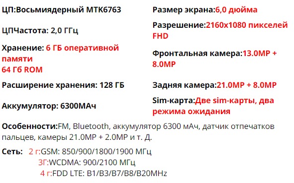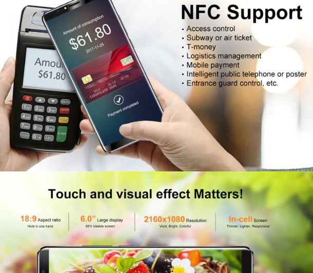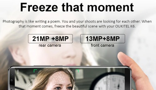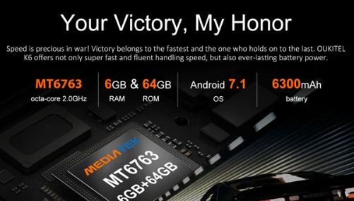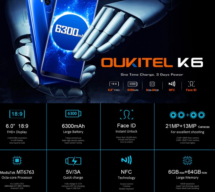 Смартфон Oukitel K6  имеет 2 или 1 + карта памяти SIM  экран: 6"  IPS  2160x1080  встроенная память: 64 ГБ  оперативная память: 6 ГБ  процессор: Mediatek MT6763V + GPU Mali-G71 MP2  ОС: Android 7.1  аккумулятор: Li-Pol, 6300 мАч (несъемный)  камера: 21 (f/2.0) + 8 Мп  NFC