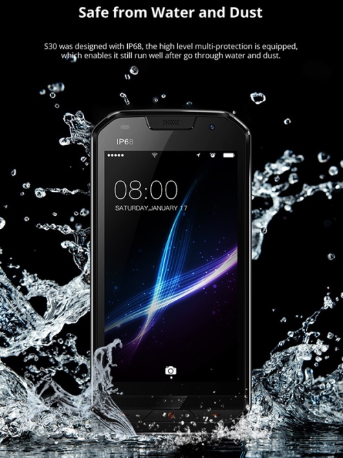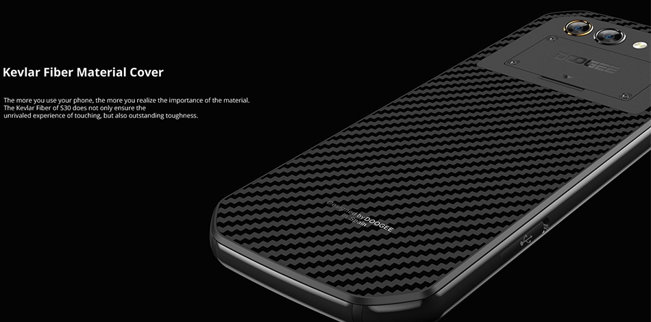 Смартфон Doogee S30 относится к новому поколению защищённых смартфонов от китайского производителя со степенью защиты IP68. Смартфон оборудован 4-ядерным процессором MTK6737V, который работает в паре с графическим ядром MaliT720. Объем оперативной памяти составляет 2 ГБ, а встроенный накопитель на 16 ГБ. При желании, встроенную память можно увеличить до 128 ГБ. Металлическая рамка корпуса защищает смартфон от царапин и падений. Материал покрытия задней крышки – Kevlar Fiber. Кевларовое волокно обеспечивает не только непревзойденное удобство при прикосновении, но и выдающуюся прочность. Дисплей сделан по IPS технологии, что обеспечивает большие углы обзора. Кроме того, он надёжно защищён от царапин и падений, производитель выбрал защитное стекло от компании Corling. В смартфоне применяется технология с двумя камерами, которая позволяет делать фото с эффектом боке. 8.0 Мп двойная камера может делать отличные снимки во время путешествия. Сенсор отпечатка пальца S30 находится на боковой кнопке, он очень чувствительный и быстрый, что позволит разблокировать Doogee S30 всего за 0.17 секунды.