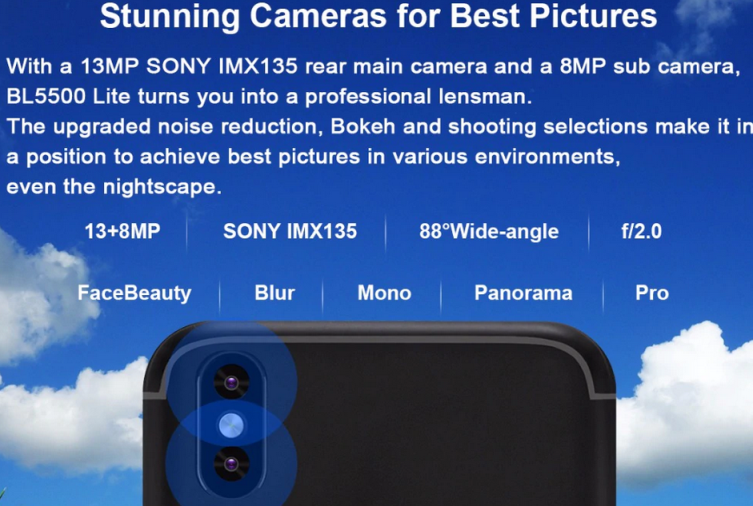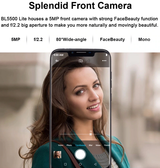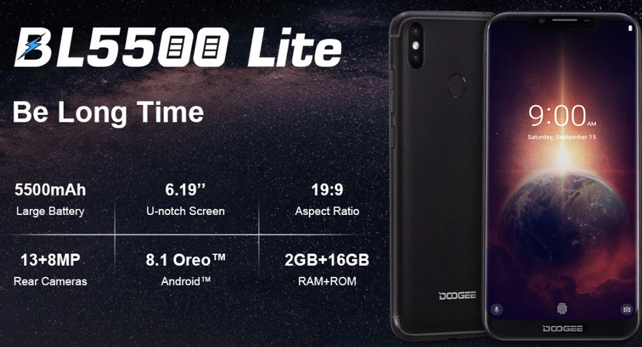 Смартфон DOOGEE  BL5500 Lite имеет: Nano-SIM; 2 (или 1 SIM + карта памяти) SIM; экран: 6,19"; IPS; 1500х720; встроенная память: 16 ГБ; оперативная память: 2 ГБ; процессор: MediaTek MTK6750T + GPU Mali-T860 MP2; количество ядер: 8; ОС: Android 8.1 (Oreo); аккумулятор: Li-Pol, 5500 мАч (несъемная); камера: 13 (f/2.0) + 8 Мп