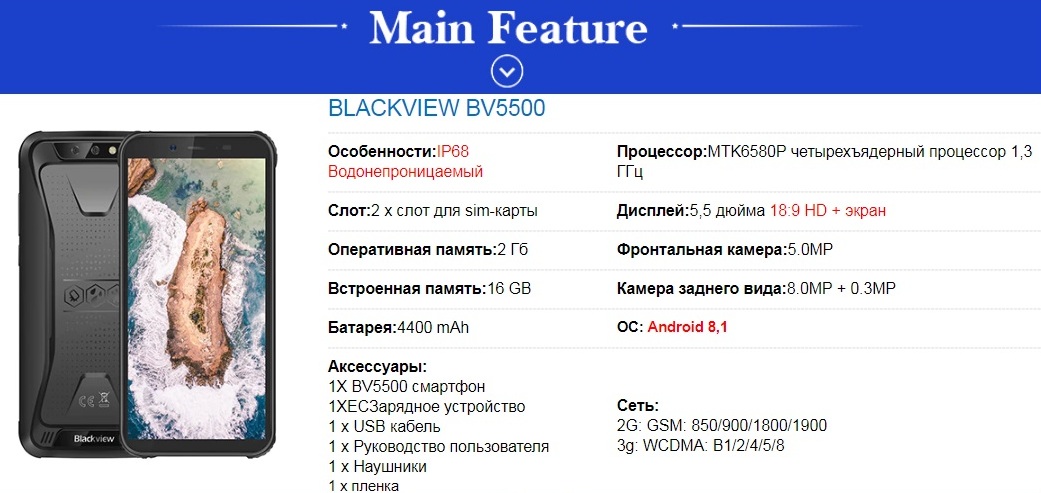 Смартфон Blackview BV5500 имееет Nano-SIM • 2 SIM • экран: 5,5" • IPS • 1440x720 • встроенная память: 16 ГБ • оперативная память: 2 ГБ • процессор: Mediatek MT6580 + GPU Mali-400MP2 • количество ядер: 4 • ОС: Android 8.1 (Oreo) • аккумулятор: 4400 мАч (съемная) • камера: 8+8 Мп