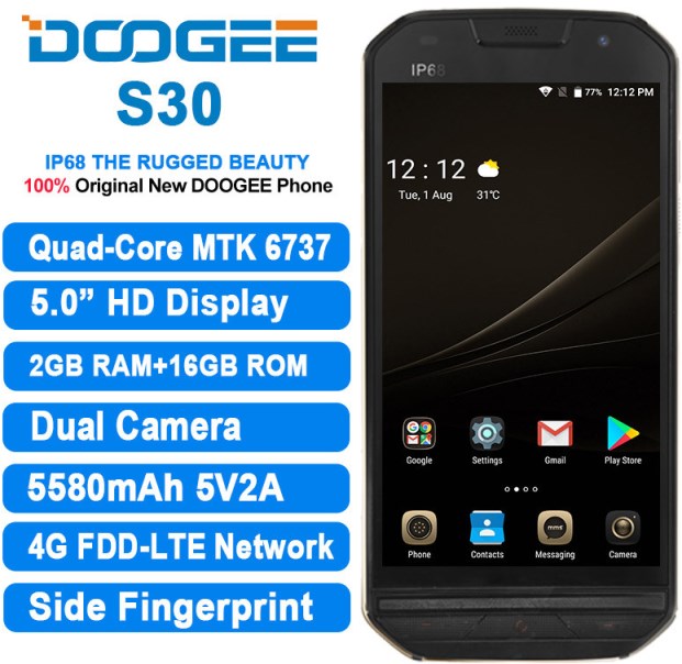 Смартфон Doogee S30 относится к новому поколению защищённых смартфонов от китайского производителя со степенью защиты IP68. Смартфон оборудован 4-ядерным процессором MTK6737V, который работает в паре с графическим ядром MaliT720. Объем оперативной памяти составляет 2 ГБ, а встроенный накопитель на 16 ГБ. При желании, встроенную память можно увеличить до 128 ГБ. Металлическая рамка корпуса защищает смартфон от царапин и падений. Материал покрытия задней крышки – Kevlar Fiber. Кевларовое волокно обеспечивает не только непревзойденное удобство при прикосновении, но и выдающуюся прочность. Дисплей сделан по IPS технологии, что обеспечивает большие углы обзора. Кроме того, он надёжно защищён от царапин и падений, производитель выбрал защитное стекло от компании Corling. В смартфоне применяется технология с двумя камерами, которая позволяет делать фото с эффектом боке. 8.0 Мп двойная камера может делать отличные снимки во время путешествия. Сенсор отпечатка пальца S30 находится на боковой кнопке, он очень чувствительный и быстрый, что позволит разблокировать Doogee S30 всего за 0.17 секунды.