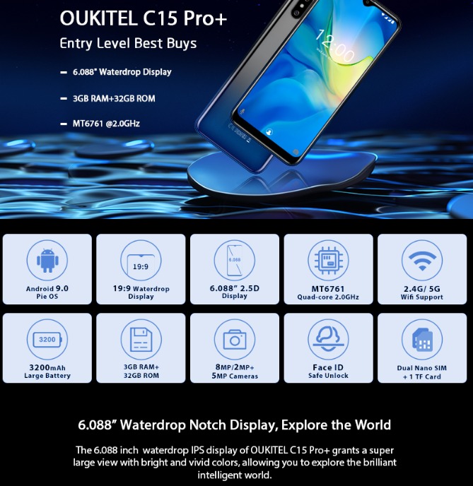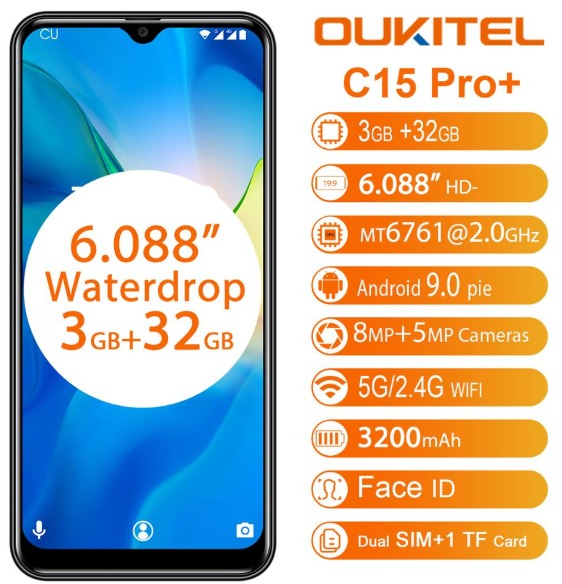 Oukitel C15 Pro, 6,09' IPS HD экран, 4 ядерный процессор, оперативная память 3GB, ROM 32Gb, Android 9.0, 2 SIM-карты