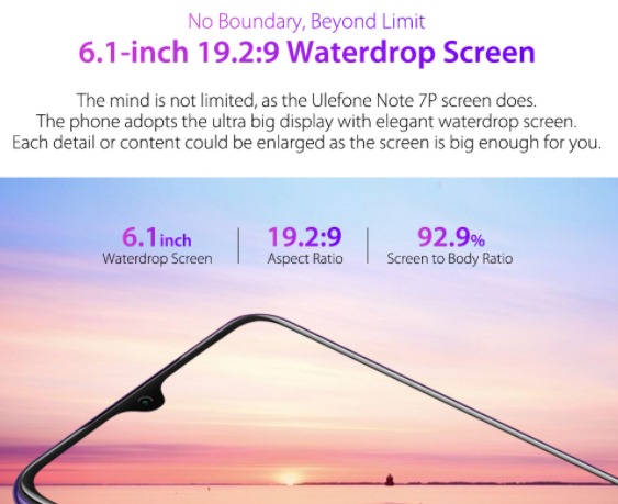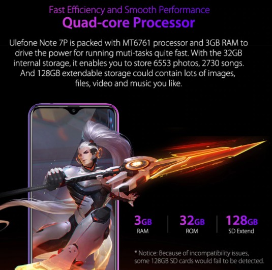 Удобный смартфон Ulefone Note 7P точно понравится пользователям, которые хотят недорого купить качественный гаджет для решения разных задач: повседневного использования, проведения выяснения и решения рабочих моментов. Представленная новинка как раз такова – она прослужит долгое время и станет настоящим помощником для своего владельца. Несмотря на невысокую стоимость, Ulefone Note 7P получил очень стильный дизайн, который оценит даже требовательная молодежь. Пластиковый корпус имеет высокое качество сборки, а большой экран занимает практически всю лицевую сторону. На нем нет рамок и горизонтальных вставок, что порадует пользователей, лишь фронтальная камера расположилась наверху в собственном каплевидном вырезе. На тыльной панели расположена тройная основная камера со вспышкой, заключенная в дизайнерский квадрат, а под ней присутствует сканер отпечатков пальцев. Диагональ экрана составляет 6,1 дюйма, а работает дисплей Ulefone Note 7P на качественной матрице IPS. Разрешение изображения здесь не очень высокое - 600 x 1280, но оно компенсируется плотностью пикселей 232 на дюйм. При заявленной цене это вполне приемлемые характеристики, которые обеспечат удобство в использовании девайса. Телефон Ulefone Note 7P получил довольно неплохой 4-ядерный процессор MediaTek Helio A22, работающий в комплекте с 3 Гб оперативной памяти. Такое сочетание позволит запускать различные игры и программы, которые не отличаются чрезмерно большим весом. За стабильную работу устройства в многозадачном режиме отвечает новейшая версия ОС Android 9.0, а для хранения файлов с личной информацией предусмотрено 32 Гб внутренней памяти с возможностью увеличения. В целом, на Ulefone Note 7P цена выставлена вполне заслуженно. Емкость батареи стандартная – 3500 мАч, которая обеспечит активное использование устройства в течение 7-8 часов.