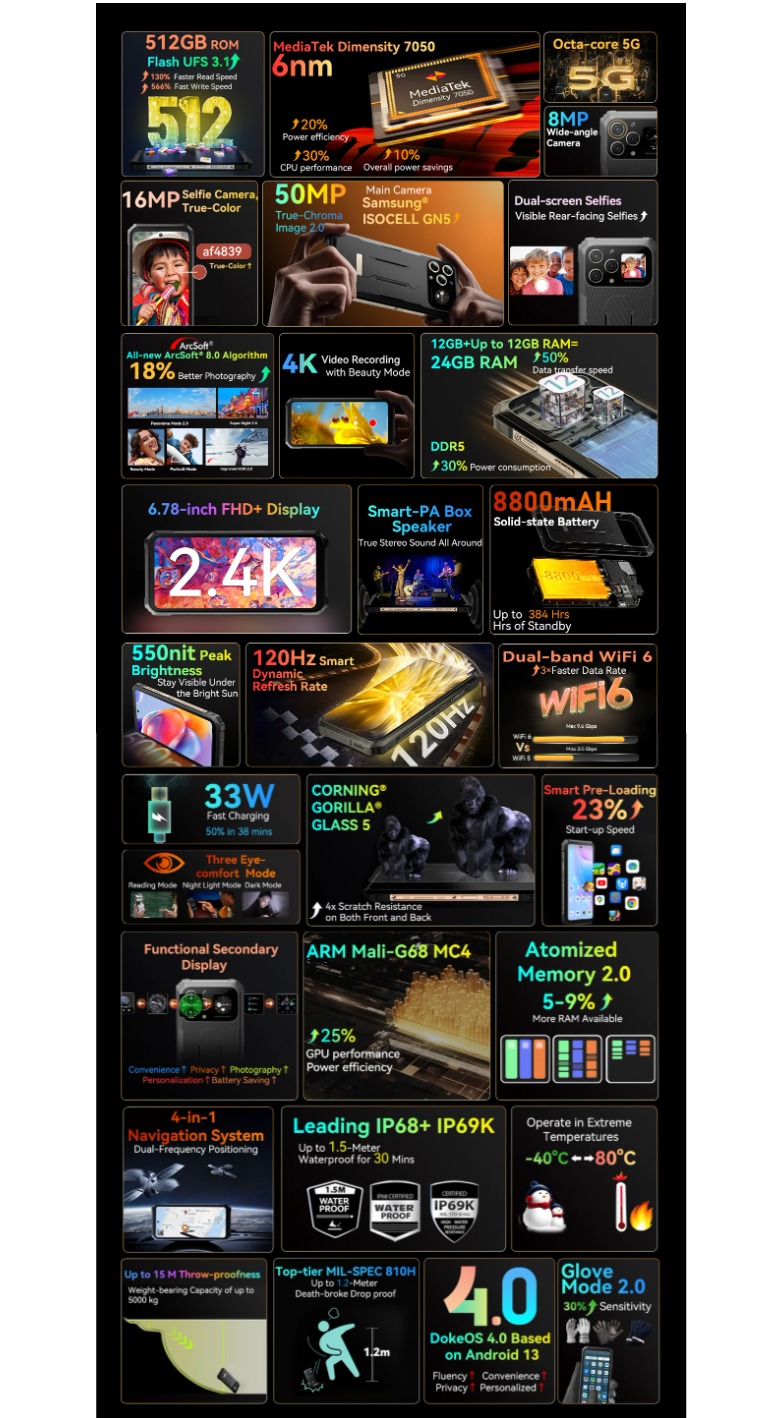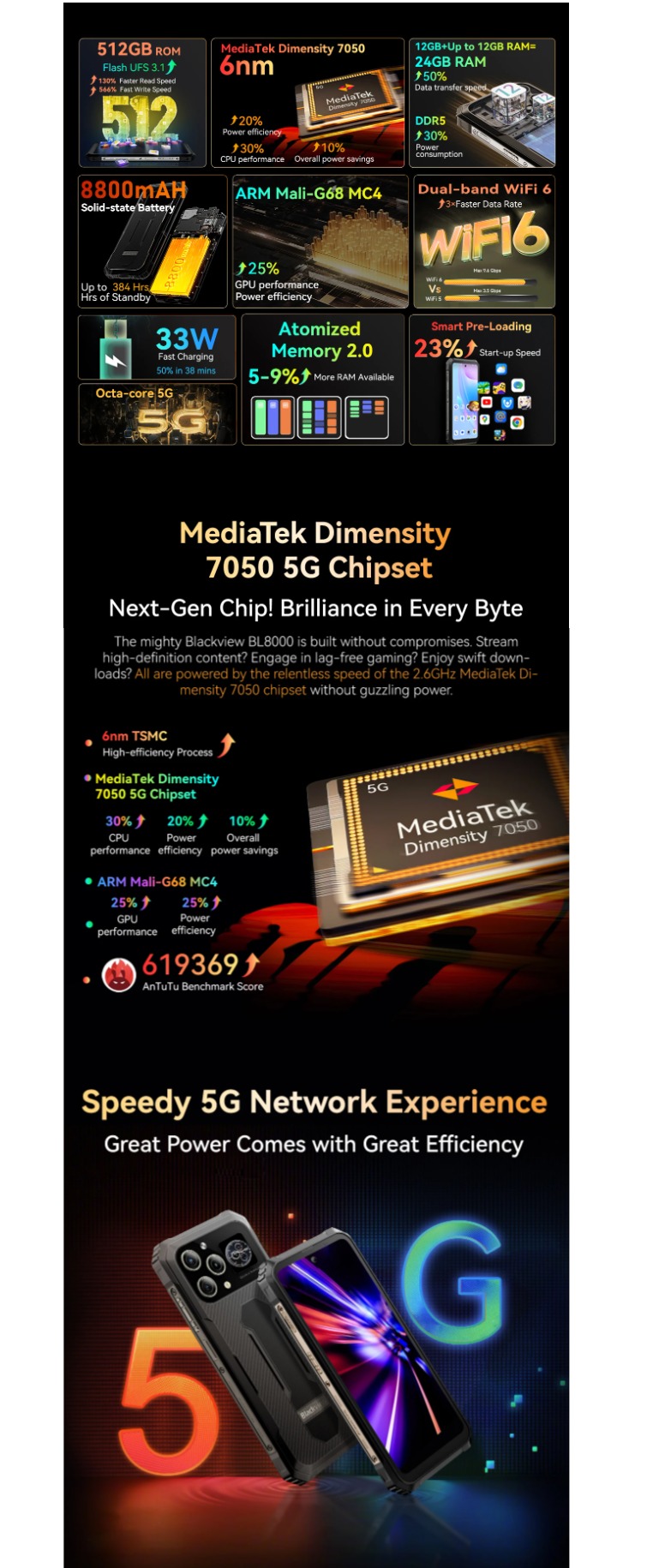 Blackview BL8000 5G 12/512GB не схожий на рядового представника захищеного сегмента, адже він оснащений потужним процесором MediaTek Dimensity 7050 та 12 ГБ оперативної пам'яті. Працює така система на фірмовій оболонці DokeOS 4.0 на базі Android 13 забезпечуючи плавну і швидку роботу навіть з найвибагливішими додатками та іграми. А з 512 ГБ убудованої пам'яті у вас з'являється величезні можливості у зберіганні великої кількості файлів, фотографій та відео.