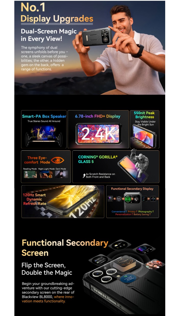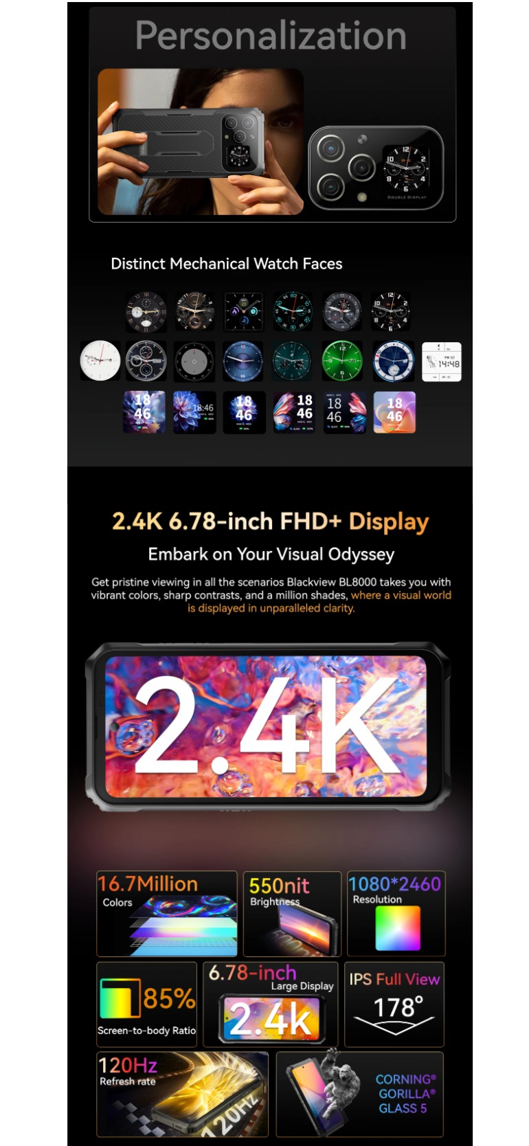 6.78 дюймовий дисплей Blackview BL8000 5G 12/512GB з роздільною здатністю 2.4K отримав підвищену частоту оновлення 120 Гц. Екран відмінний, слабких сторін у ньому просто немає, плюс до всього скло Corning Gorilla Glass Victus захищає його від подряпин та пошкоджень. Головною фішкою новинки BL8000 став другий невеликий 1.32-дюймовий задній дисплей, який значно підвищує комфорт використання.