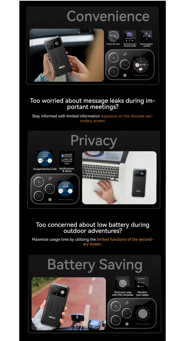 Задній дисплей: 1,3 дюйма, роздільна здатність 240*240; CORNING® GORILLA* GLASS 3 (Victus); Частота оновлення 60 Гц