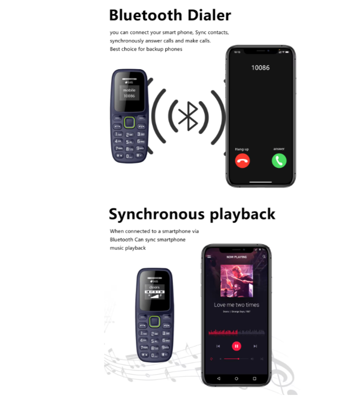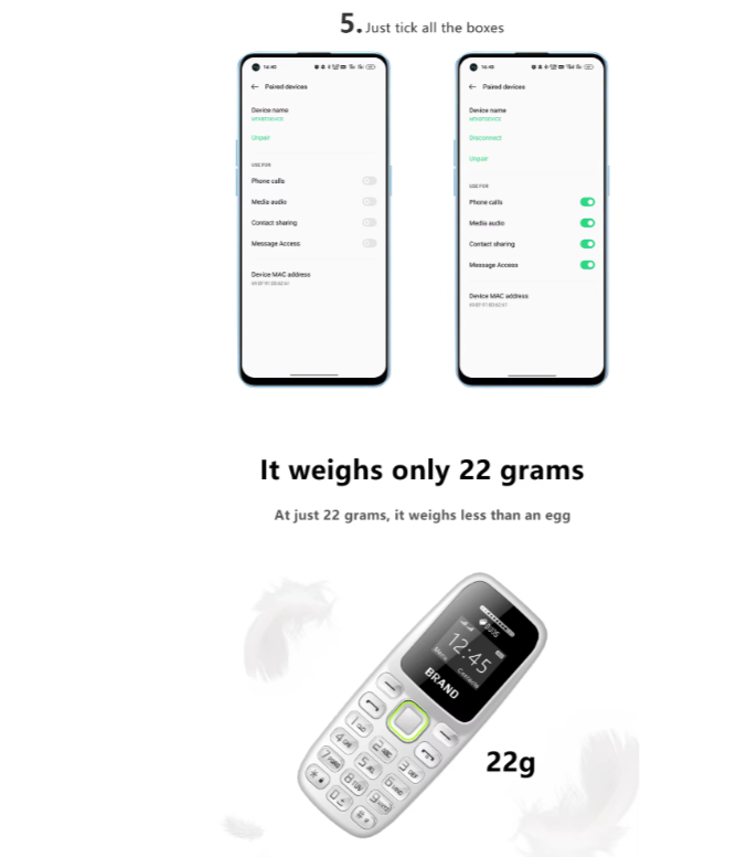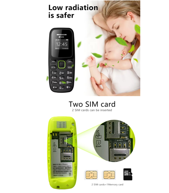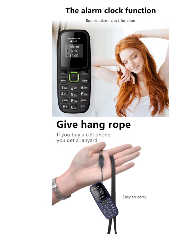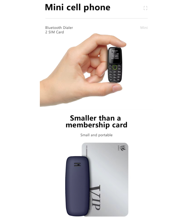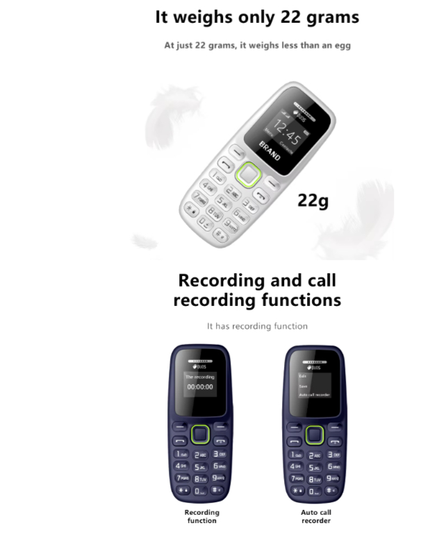 телефон надзвичайно маленького розміру. Розмір мобільного телефону всього 68*28*13 мм, а вага всього 22 г. Легко носити