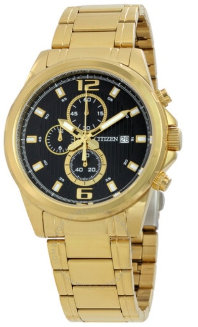 Корпус та браслет із нержавіючої сталі золотистого кольору. Фіксований безель золотистого кольору. Чорний циферблат з люмінесцентними золотистими стрілками та годинниковими мітками. Арабські цифри позначають позиції 6 та 12 годин. Хвилинні позначки по зовнішньому краю. Тип циферблату: Аналоговий. Люмінесцентні стрілки та маркери. Відображення дати в положенні "3 години". Хронограф - відображення трьох додаткових циферблатів: 60 секунд, 60 хвилин та 12 годин. Кварцовий механізм. Стійке до подряпин мінеральне скло. Міцна задня кришка. Розмір корпусу: 44 мм. Кругла форма корпусу. Застібка з кнопкою. Водонепроникність 100 м. Функції: хронограф, дата, годинник, хвилини, секунди. Спортивний годинник.