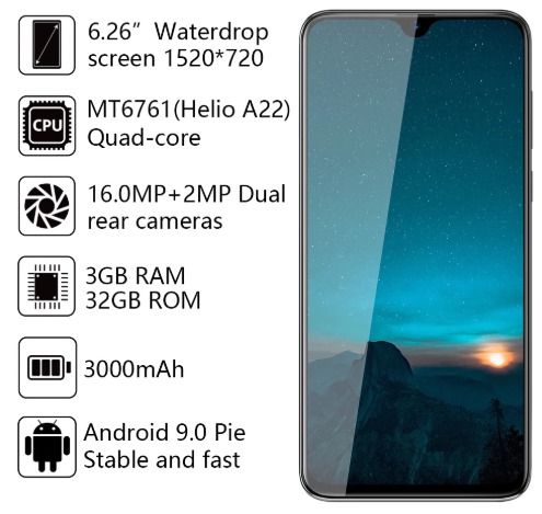 Простой и привлекательный дизайн Cubot R15 Pro можно назвать образцом классичности: тонкий корпус легко лежит в ладони, а большой экран очень удобен для использования и не имеет никаких лишних декоративных элементов. Исключением является только фронтальная камера в каплевидной вставке, но она лишь подчеркивает утонченность девайса. Обратная панель матовая и тоже не имеет никаких излишеств – там расположился круглый датчик дактилоскопии и двойная основная камера со вспышкой. Желающие могут купить Cubot R15 Pro в Украине в зеленом или черном цвете. Функциональный телефон Cubot R15 Pro получил большой дисплей диагональю 6,26 дюйма, основой которого стала красочная цифровая панель IPS, передающая всю насыщенность цветов и оттенков. Среднее качество картинки 720 x 1520 точек и плотность отображения 269ppi. Стандартный, но качественный 4-ядерный процессор MediaTek Helio A22 вместе с 3 Гб оперативной памяти – это основа девайса, которой вполне достаточно для запуска базовых приложений и легких игр. Конечно, тяжелые программы смартфон Cubot R15 Pro не осилит, но он предназначен для повседневного использования и обычной нагрузки. Гаджет работает на современной платформе Android 9.0 и имеет 32 Гб внутреннего хранилища для пользовательских файлов и программ. За графику отвечает надежный чип PowerVR GE8300. Стандартный аккумулятор емкостью 3000 мАч подарит возможность пользоваться аппаратом в течение 8-9 часов без необходимости подзарядки. Основная камера получила разрешение 16 Мп, фронталка – 13 Мп. Этих показателей вполне достаточно для того, чтобы делать красочные снимки и автопортреты.