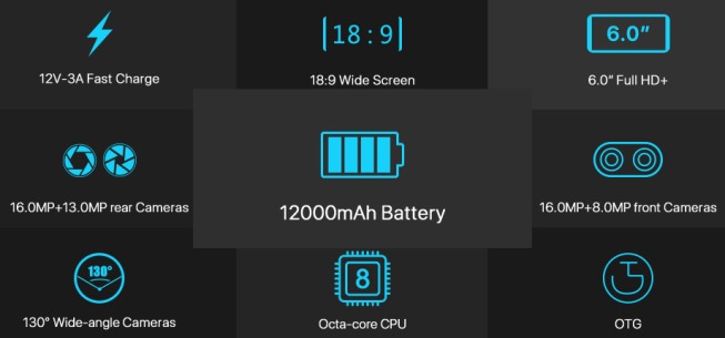 Nano-SIM; 2 (или 1 SIM + карта памяти) SIM; экран: 6"; IPS; 2160x1080; встроенная память: 32 ГБ; оперативная память: 4 ГБ; процессор: Mediatek MT6750T + GPU Mali-T860; количество ядер: 8; ОС: Android 7.0 (Nougat); аккумулятор: 12000 мАч (несъемная); камера: 16 + 13 (f/2.0) Мп.