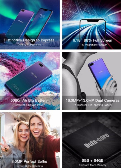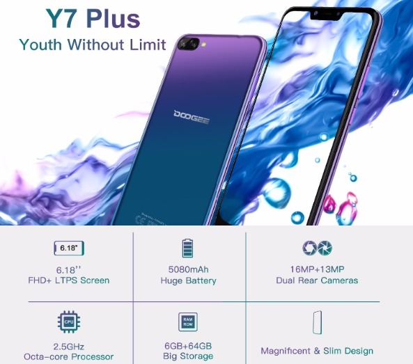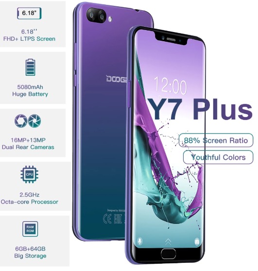DOOGEE Y7 Plus, 6,18' FHD экран, DUAL SIM, 8 ядерный процессор, оперативная память 6GB, ROM 64Gb, Android 8.1