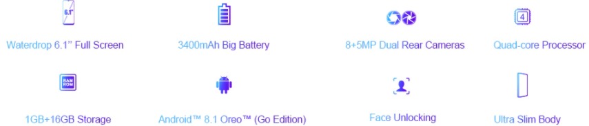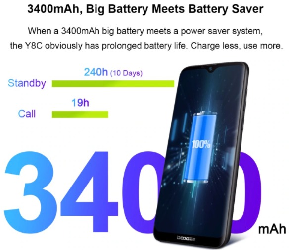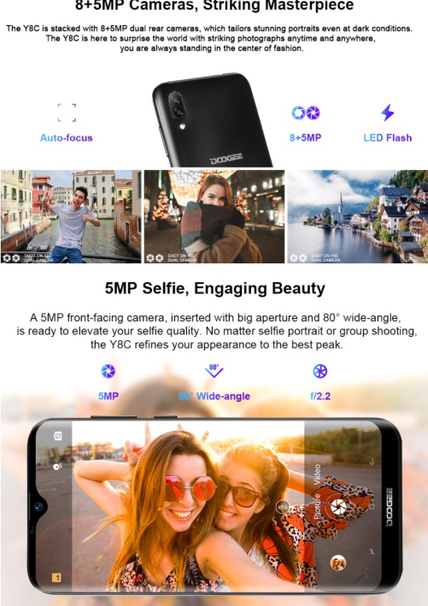 Doogee Y8C имеет прочный пластиковый корпус и большой безрамочный дисплей, который занимает 82% лицевой панели. На нем находится модуль фронтальной камеры в каплевидной форме, что полностью соответствует современным модным тенденциям. На тыльной стороне расположена двойная основная камера, вспышка и логотип компании. В целом, это очень привлекательный девайс, который порадует даже требовательных пользователей. Doogee Y8C в Украине продается в голубом, черном и серебристом цвете. Диагональ дисплея составляет 6,1 дюйм. Смартфон Doogee Y8C получил отличный экран, который работает на удобной матрице IPS, гарантирующей отличную цветопередачу. За качество изображения отвечает плотность 232 пикселя на дюйм – этого достаточно для комфортного использования гаджета. Купить Doogee Y8C стоит также ради неплохих технических показателей, ведь здесь установлен хороший процессор Mediatek MT6580M на 4 ядра, функционирующий вместе с 1 Гб ОЗУ. Девайс работает на современной операционной системе Android 8.1, которая позволяет быстро и без проблем устанавливать различные приложения. Серьезные современные игры и программы гаджет не потянет, но с обычными нагрузками вполне справится. Внутренней памяти здесь 16 Гб, но ее можно увеличить флеш-картой. Учитывая, что на Doogee Y8C цена невысока, это прекрасные характеристики. Емкость батареи стандартная – 3400 мАч, которых хватит для целого дня активной эксплуатации. При желании, у нас можно выгодно купить повербанк для дальних поездок. Камеры также не разочаруют покупателей, ведь основной модуль на 8 Мп позволяет делать отличные фотографии при хорошем свете, а фронтальная камера на 5 Мп дает возможность с комфортом общаться по вайберу или скайпу.