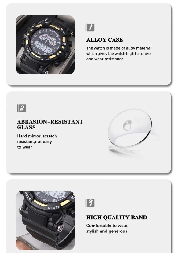 • Матеріал силіконового ремінця: силіконовий ремінець годинника зручний у носінні та міцний, що робить його ідеальним для спорту та повсякденного використання.