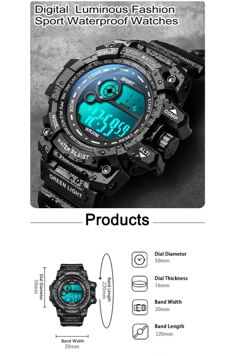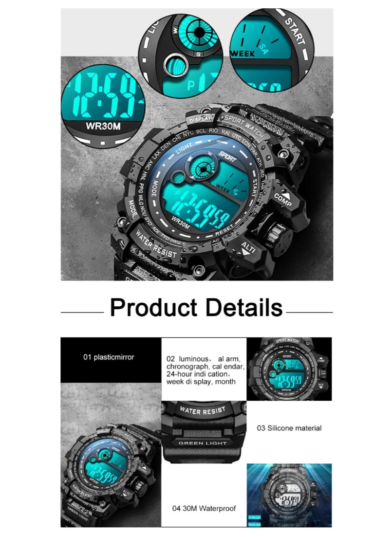 • Функція підсвічування: цей чоловічий цифровий наручний годинник має світловий дисплей, що забезпечує легку видимість навіть в умовах слабкого освітлення.