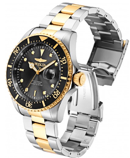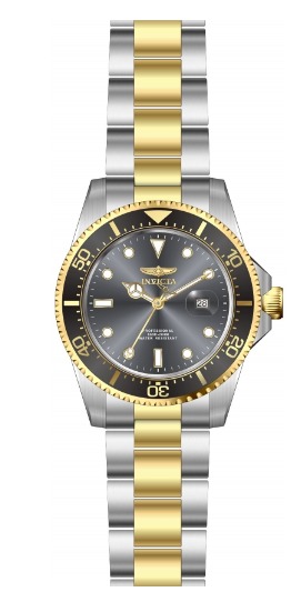 Цей привабливий годинник Invicta з колекції Pro Diver оснащений кварцовим механізмом і сталевим корпусом з цільного золота. Його циферблат прикрашений сірим металевим циферблатом і захищений міцним кристалом Flame Fusion. Сріблястий і золотий ремінець із нержавіючої сталі завершує цей годинник, який може протистояти воді на глибині до 200 метрів.