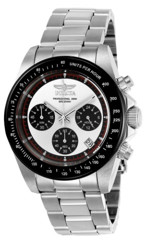 • Цей привабливий годинник Invicta із колекції Speedway оснащений кварцовим механізмом і міцним чорним сталевим корпусом. Його циферблат прикрашений чорно-білим металевим циферблатом і захищений міцним мінеральним кристалом. Срібний ремінець із нержавіючої сталі завершує цей годинник, який може протистояти воді до 200 метрів.