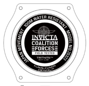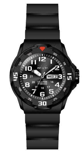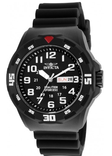 • Цей чудовий годинник Invicta Coalition Forces оснащений кварцовим механізмом у приголомшливому чорному корпусі. На його лицьовій стороні зображено чорний металевий циферблат, захищений високостійким кристалом Flame Fusion. Цей годинник доповнюється чорним силіконовим ремінцем і забезпечує водонепроникність до 100 м.