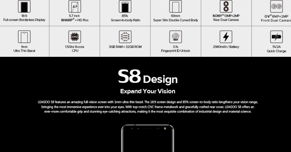 Leagoo S8 позиционируется как эффектный и доступный безрамочный смартфон. Дизайн у модели получился весьма необычным. Тыльная панель с 3D оформлением и чарующей глянцевой отделкой таинственно переливается на свету. Презентабельный внешний вид девайса с плавными переходами заслуживает лучшей оценки. Заказать Leagoo S8 можно в черном или синем цвете. Толщина корпуса составила всего 7,9 мм. Скорость распознавания отпечатков, согласно заявлению производителя, составляет всего 0,1 сек. Слот для сим карт и стандартные механические кнопки перенесены на правый торец.