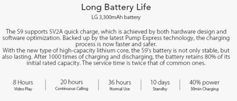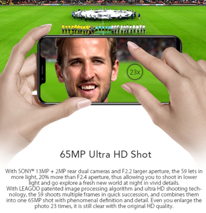 За производительность безрамочного Leagoo S9 6" отвечает 8 ядерный процессор от компании Mediatek MTK6750T имеющий рабочую тактовую частоту 1,5 ГГц. Обработкой изображений и видео в приложениях и играх занимается 2-х ядерный MaliT860MP с тактовой частотой 520 МГц. Современный процессор будет обеспечивать стабильную и производительную работу любой игры и приложения на максимальном уровне, об этих достижениях также говорят и пользователи Leagoo S9 в своих отзывах после первых дней пользования смартфоном. Внутри Leagoo S9 не только мощный процессор и красивый дисплей. Кроме этого, также присутствует и достаточный объём памяти. Оперативной памяти в смартфоне предустановлено 4 гигабайт, чего вдоволь достаточно для быстрого выполнения задач, а также многозадачности. Для хранения вам предоставляется объём хранилища на 32 гигабайт с дополнительной возможностью установки карты MicroSD до 128 гигабайт. Смартфон Leagoo S9 32 GB оснащён не менее качественной камерой, чем в других современных устройствах. Новинка имеет двойной модуль основной камеры от Sony IMX258 с разрешением 13 МП, позволяющий делать качественные фото добавляя к ним различные эффекты. Качество фотограий на фронтальную камеру обеспечивает линза с разрешением 8 МП. Для долгой и приятной работы со смартфоном Leagoo S9 производитель поместил в него ёмкий аккумулятор на 3300 мА/ч. При постоянном пользовании интернетом, играми, просмотром фильмов полный аккумулятор может работать в таком режиме до 8 часов без подзарядки. А при простом пользовании не при серьёзных нагрузках 100% заряд обеспечит работу на протяжении 2-3 дней.