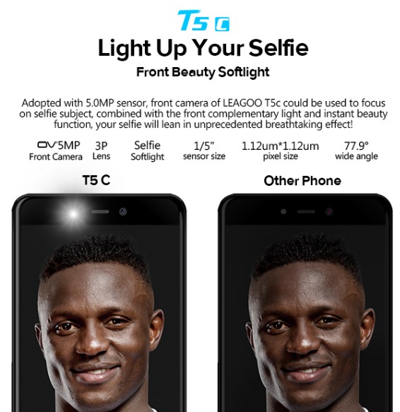 Доступний смартфон з гідними характеристиками, який знає чим виділитися з маси міцних бюджетників. Модель примітна використанням в якості основи апаратної бази восьмиядерного процесора Spreadtrum SC9853i, виконаного по 14-нм техпроцесу компанії Intel. Він перевершує рішення найближчих конкурентів як за продуктивністю, так і в плані енергоефективності. Принаймні, так заявляє компанія-виробник Leagoo T5C. Обсяги пам'яті в активах смартфона цілком стандартні: 3 ГБ ОПЕРАТИВНОЇ пам'яті і 32 ГБ ПЗП (з можливістю розширення місткості сховища даних за рахунок карти пам'яті microSD). У пристрої встановлений 5.5-дюймовий FullHD-дисплей класичного формату 16:9. Зі свіжих трендових віянь моди, моделі дісталася здвоєна основна камера 13 + 2 МП, у якій допоміжний модуль зайнятий питаннями розмиття фону при фотозйомці в портретному режимі. Фронталка тут скромніше — на її роль призначений 5 МП сенсор зображення. Енергією з електронними компонентами смартфона ділиться незнімний акумулятор ємністю 3000 мАгод.