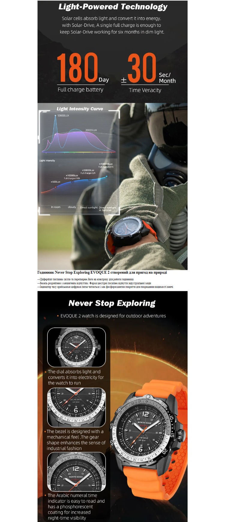 North Edge Evoque 2  - це ультрасучасний годинник, який використовує силу світла, легко перетворюючи її на енергію, щоб годинник працював безперебійно.
