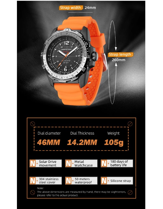 Завдяки передовій технології годинник North Edge Evoque 2 зберігає надлишок енергії в елементі живлення великої ємності. Після повної зарядки він може працювати місяцями навіть в умовах слабкого освітлення або темряви, забезпечуючи безперебійну точність відліку часу. Це означає, що ви можете сміливо виконувати повсякденні справи, знаючи, що ваш годинник ніколи вас не підведе.