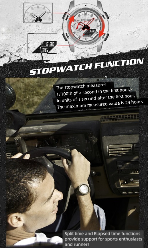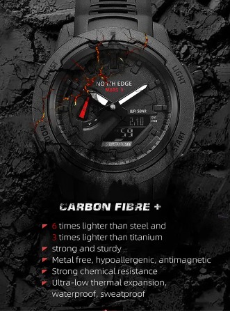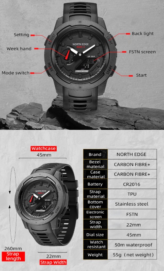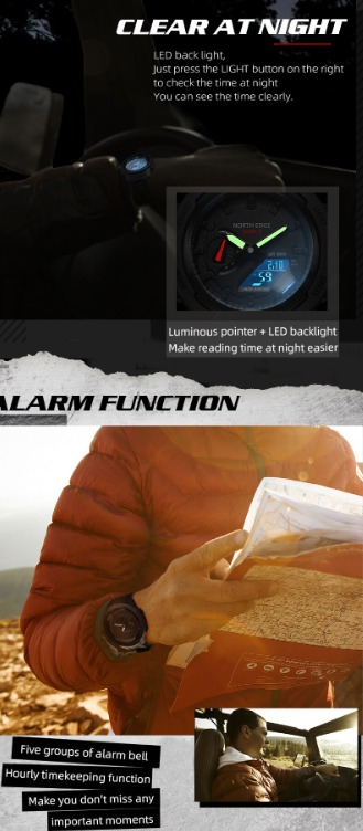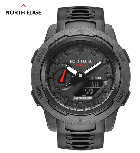 Контроль рухуСлідкуйте за тим, скільки ви рухаєтеся: функція педометра зберігає дані про те, скільки кроків ви пройшли, яку відстань, скільки калорій витратили. Ви можете переглянути та порівняти інформацію за останній місяць.Контроль часуГодинник допоможе з тайм-менеджментом для різних завдань. Доступні будильник, таймер зворотного відліку та секундомір з додатковою функцією split time – визначення часу, необхідного для подолання дистанції, що складається з кількох відрізків, наприклад, кругів на біговій доріжці.EL-підсвічування дисплеяЕлектролюмінесцентне підсвічування спрощує використання годинника в темряві, не сліпить очі та вмикається простим натисканням кнопки.НадійністьГодинник North Edge Mars виготовлений з міцних, зносостійких матеріалів і може витримувати удари та падіння. Водонепроникність 50 м означає, що годинник повністю зберігає працездатність, якщо на нього потрапить вода: під дощем, під час миття рук і навіть якщо ви забудете його зняти перед купанням.