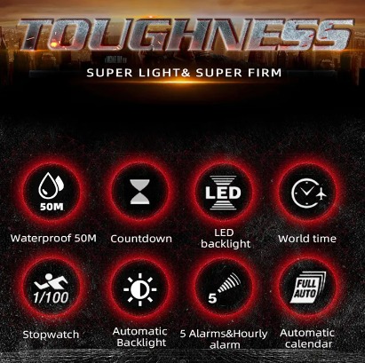 1. Режим 12/24 години, година, хвилина, секунда, місяць, день, тиждень 2. Секундомір 3. Зворотний відлік 4. Будильник (5 груп), погодинний годинник 5. Світовий час 6. DST (літній час) 7. Світлодіод Підсвічування (Автопідсвічування) 8. Автоматичний календар 9. Водонепроникний 50М
