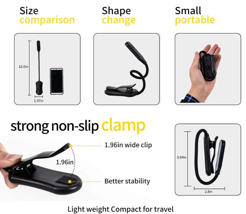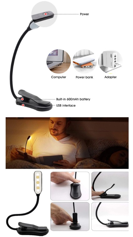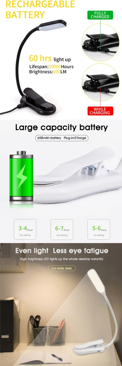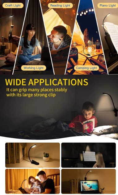 【3 типа яскравості 】Загалом 7 світлодіодів і 3 режими яскравості, 3 колірні температури (від 3000K до 6500K). Натисніть перемикач і утримуйте протягом 3 секунд, щоб змінити колір світла. Задоволення різних потреб у світлі в повсякденному житті, таких як читання, робота, навчання, шиття. 【Легко заряджати】Вбудований літієвий акумулятор і порт micro USB. Насолоджуйтесь бездротовим читанням 30 ГОДИН без заряджання з налаштуванням яскравості (теплий, низький). Стандартний кабель micro-USB для Android у комплекті. Дозволяє заряджати ліхтарик через ноутбук, акумулятори живлення, зарядний пристрій для телефону 5 В (не входить у комплект). 【Захист очей і відсутність мерехтіння】 Є 3 рівні кольори, стабільна та ідеальна яскравість, яка забезпечує комфорт для ваших очей і захищає ваші очі від блискучої травми та випромінювання.【Легкий і портативний дизайн】Малий розмір, ідеально підходить як підсвічування книг, нічні лампи, підсвічування пюпітра, підсвічування комп’ютера, настільне освітлення або для читання в узголів’ї, кемпінгу, дитячого нічного читання, навчання, клавіатури, Kindle, макіяжу, шиття, малювання, пошиття одягу, завдання та хобі. 【Гнучка шия та міцна кліпса】 Ця кліпса є гнучкою та забезпечує функціональність на 360 градусів. Подвійна гумова накладка на кліпсі захищає сторінки від пошкодження.