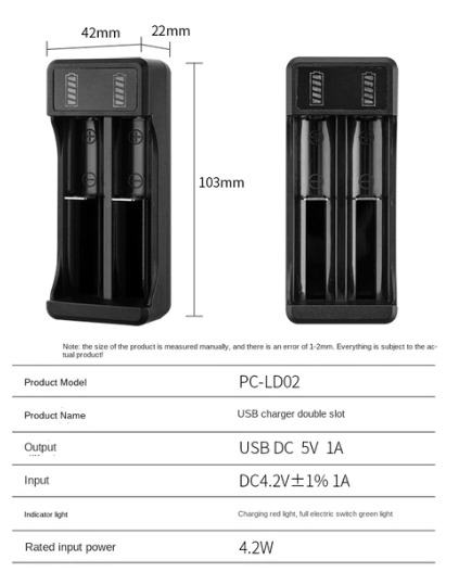 Входное напряжение: DC5V 1-2A обычный источник питания USBВыходное напряжение: DC4.2V 1000mAСертификация продукта: CE ROSHСовместимая батарея: АА, ААА, 18650 10400 14500 16340 16650 14650 18350 18500 и так далее перезаряжаемая литиевая батареяФункциональные особенности: независимая зарядка с несколькими слотами, отсутствие помех, двухцветный индикатор зарядки, красный свет при зарядке, полный заряд - автоматический стоп, не будет перезаряжаться.