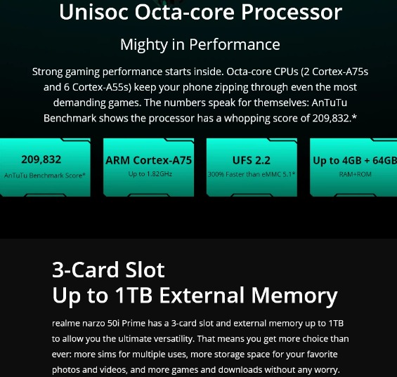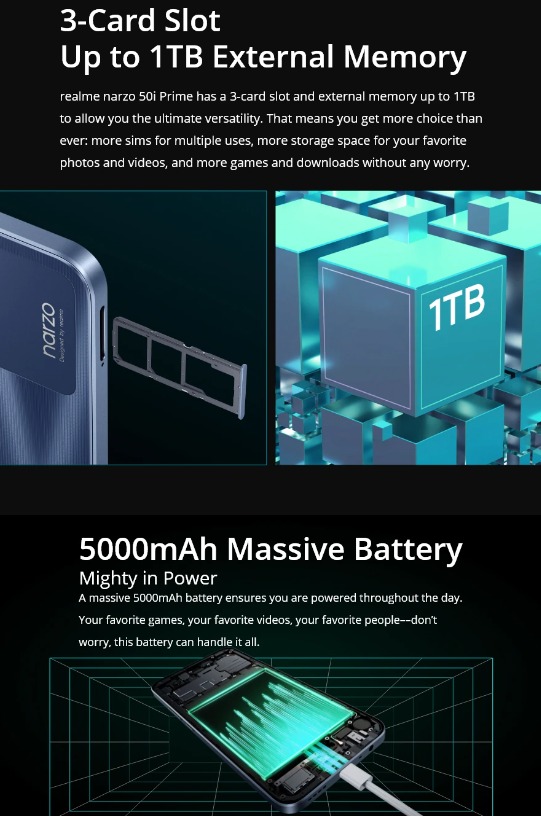 Realme Narzo 50i Prime, 6,5' HD+ IPS екран, 2 SIM, 8 ядерний процесор, оперативна пам'ять 3GB, ROM 32Gb, Android 11