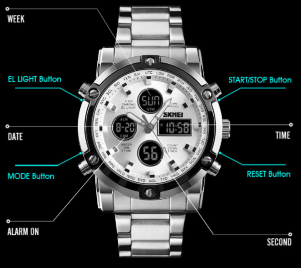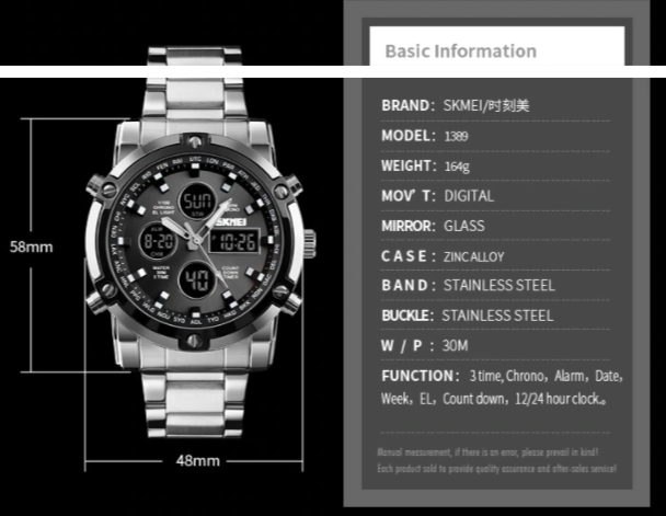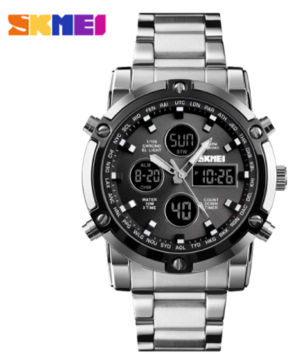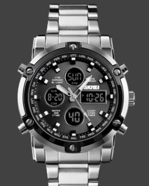 Прекрасные мужские комбинированные кварцевые часы известного бренда SKMEI 1389. Их массивный мужественный вид дополняет стилизованный под корпус изделия браслет, что создает гармоничную картину продвинутого аксессуара на руке владельца.Материалом корпуса устройства является нержавеющая сталь с элементами крепежных деталей, дополняющих дизайн мужских часов плюс ручка для завода и кнопки управления. Циферблат изделия стрелочный в комбинации с цифровым. Формат времени можно выставить как 12, так и 24- часовой. В набор функций данных часов входит отображение часов, минут, секунд, текущего числа, месяца, дня недели. Комфортность пользования изделия подчеркивают наличие подсветки, будильника, секундомера, таймера, отображение времени двух часовых поясов, ежечасный сигнал. Масса данных часов с браслетом составляет более 160 грамм. Длина комплекта имеет 220 мм. Первое подтверждает то, что они в полной мере изготовлены из металлов. А изменить длину согласно обхвату собственной руки владельцу можно вынимая секции из браслета или застежкой (в меньшей мере). Конструкция фиксатора на руке позволяет удерживаться тяжелым часам надежно и, по-возможности, неподвижно.