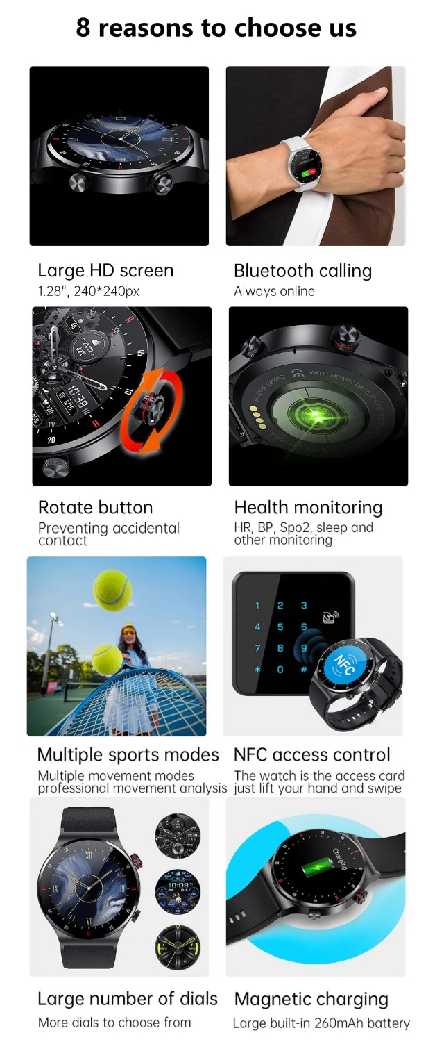 Дзвінки через Bluetooth, NFC, частота серцевих скорочень/артеріальний тиск/кисень у крові/тиск/ЕКГ/моніторинг сну, відображення дати/тижня, прогноз погоди, менструальний цикл (стать програми встановлено лише для жінок), зворотний відлік, керування картками, дистанційна фотографія, нагадування про сидячий спосіб життя, підрахунок кроків, відстань, калорії, керування музикою через Bluetooth, нагадування про дзвінок, нагадування про SMS, нагадування про повідомлення в соціальній програмі, нагадування про будильник, режим тренувань, підніміть руку, щоб зробити екран яскравішим, знайти мобільний телефон, секундомір, відхилити дзвінки, зробити режим «не турбувати», перемикання з кількома номерами, регулювання яскравості, оновлення мікропрограми тощо.