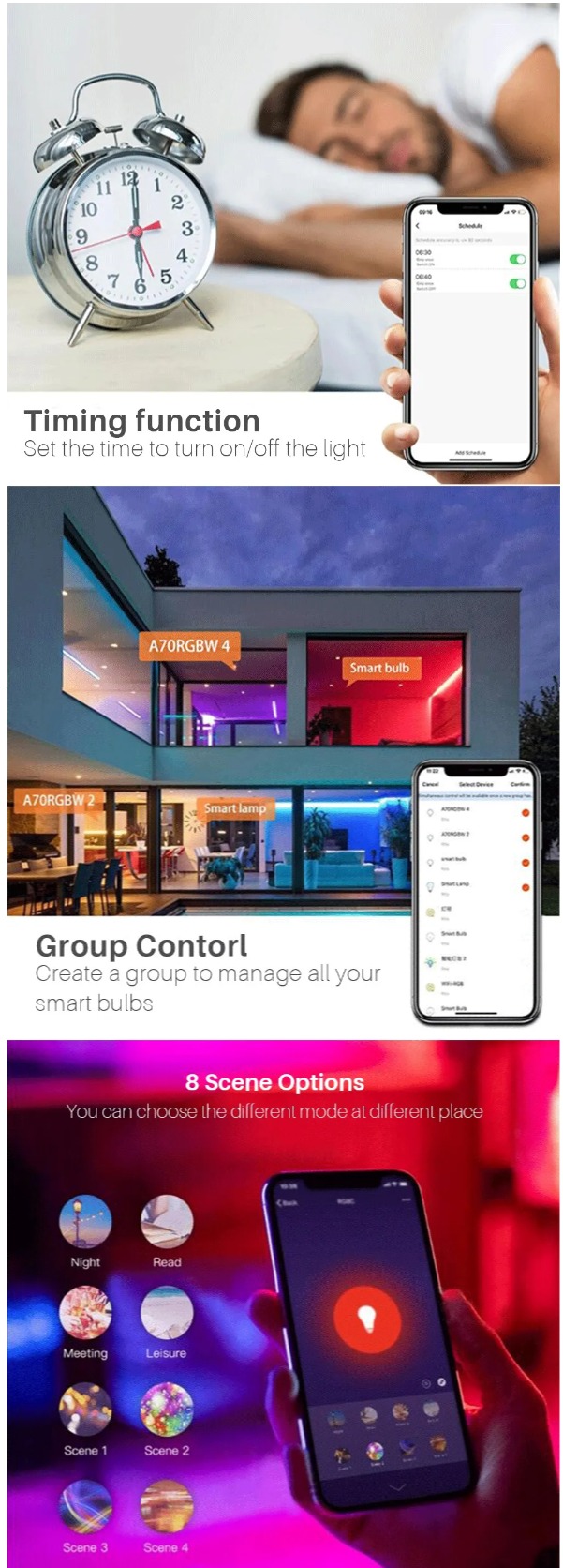 Синхронізація сцени та музики: стандартна сцена APP змінюється, ви також можете редагувати власну сцену та налаштувати зміну кольору. Існує синхронізація музики, ви можете відкрити музичний APP на своєму мобільному телефоні, і smart life APP автоматично фіксує зміни ритму, щоб реалізувати зміни ритму світла та музики.