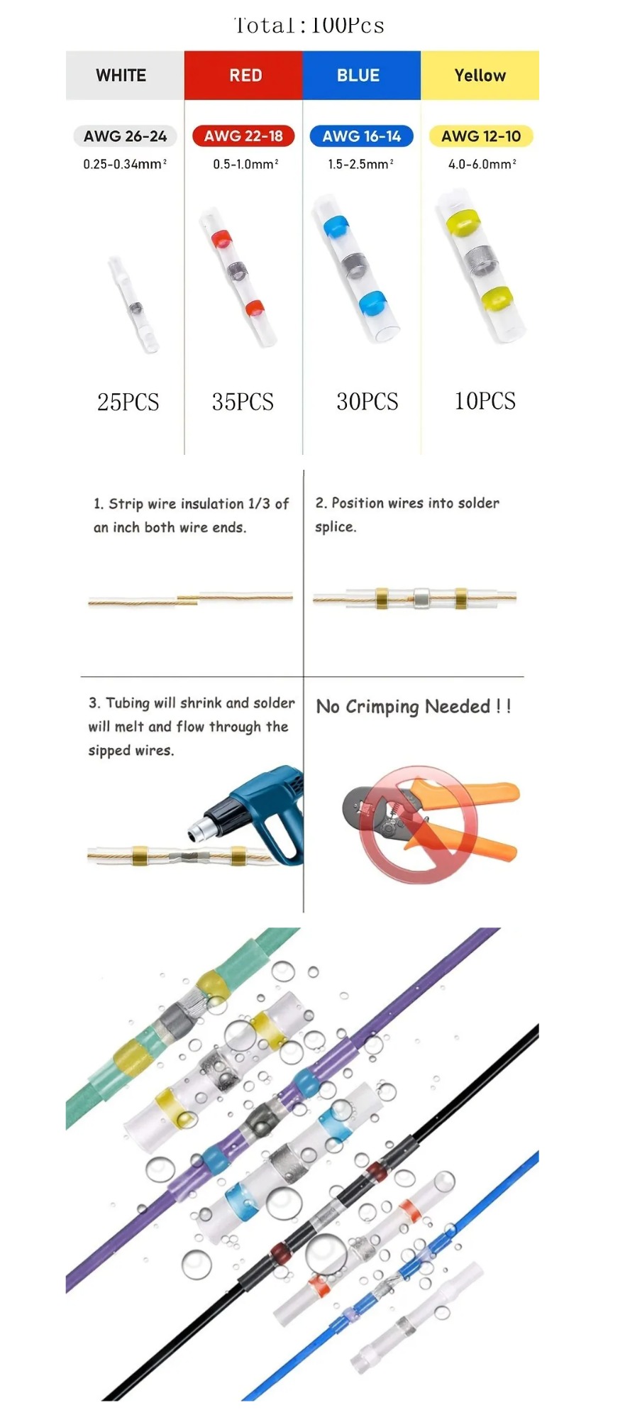 Роз’єми поставляються в коробці для зберігання, яку легко зберігати та носити. Труби з кольоровим кодуванням дозволяють легковизначити потрібний розмір з’єднувача для кожного застосування. Асортимент роз’єміввключає білі (AWG 26 – 24), червоні (AWG 22 – 18), сині(AWG 16 – 14) і жовті (AWG 12 – 10) з’єднувачі під пайку, які можнавикористовувати на проводі AWG від 26 до 10.