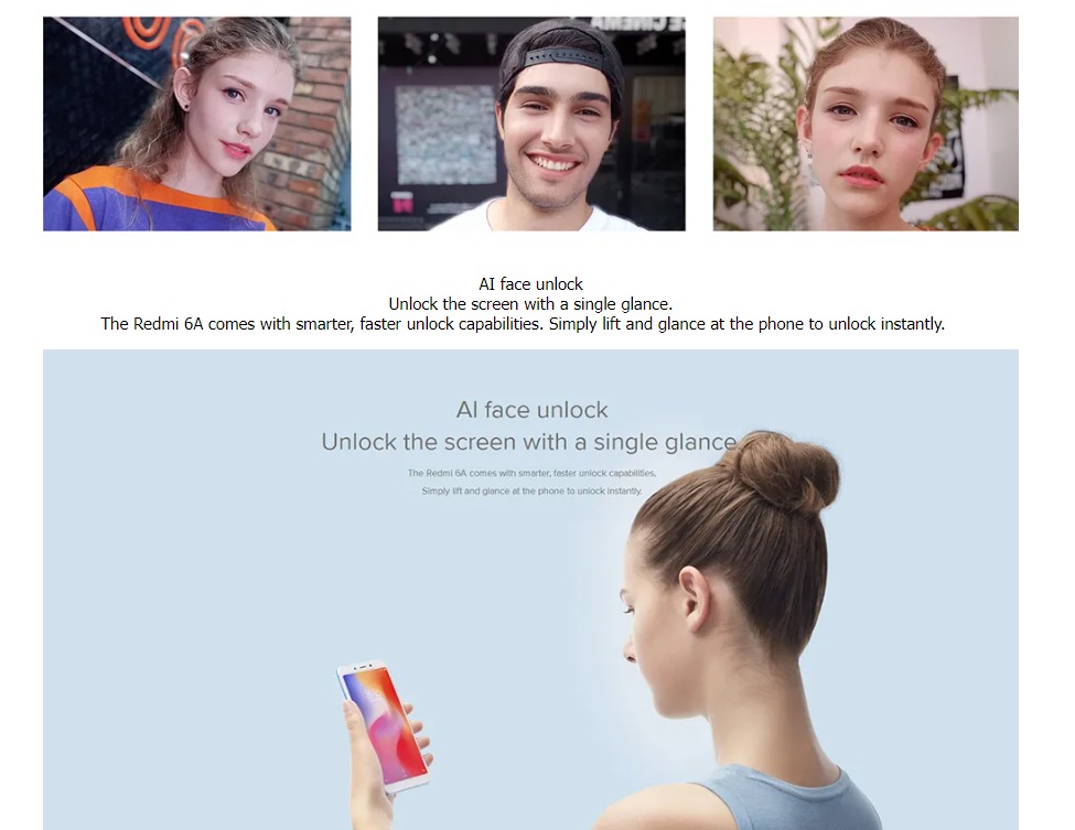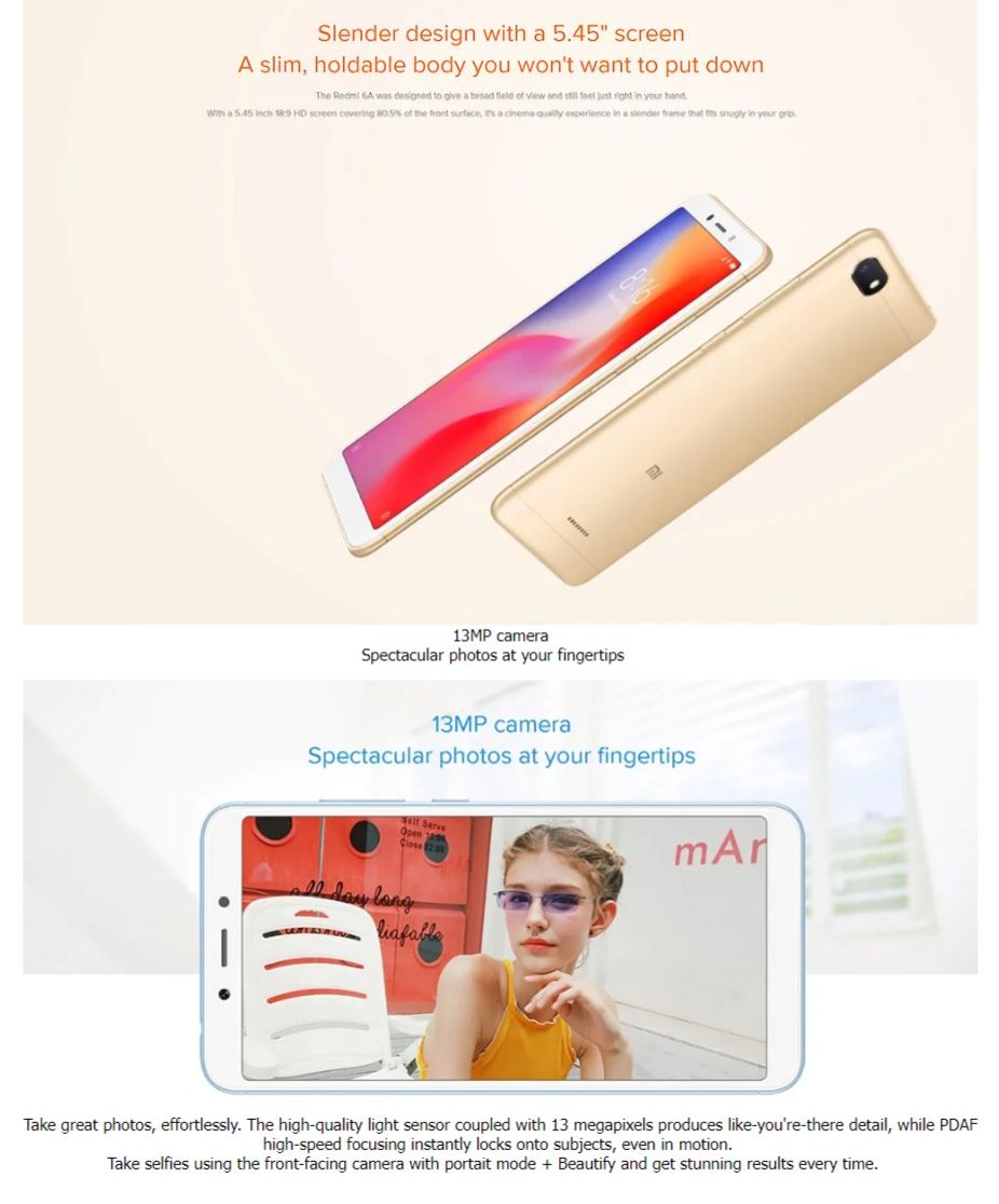 Модель Xiaomi Redmi 6A містить 5,45-дюймовий дисплей з роздільною здатністю HD+. Застосовується процесор Media Tek Helio A22, який працює на частоті 2, ГГц, як і Helio P22, але кількість обчислювальних ядер 4. Об'єм оперативної пам'яті 3 ГБ, а ємність вбудованого сховища – 32 ГБ. При цьому збережено можливість розширення сховища за допомогою картки пам'яті microSD. У моделі Xiaomi Redmi 6A використовується одиночна 13-мегапіксельна камера на задній панелі. Камера на лицьовій панелі має 5-мегапіксельний сенсор. Місткість батареї збережена на рівні 3000 мАг.