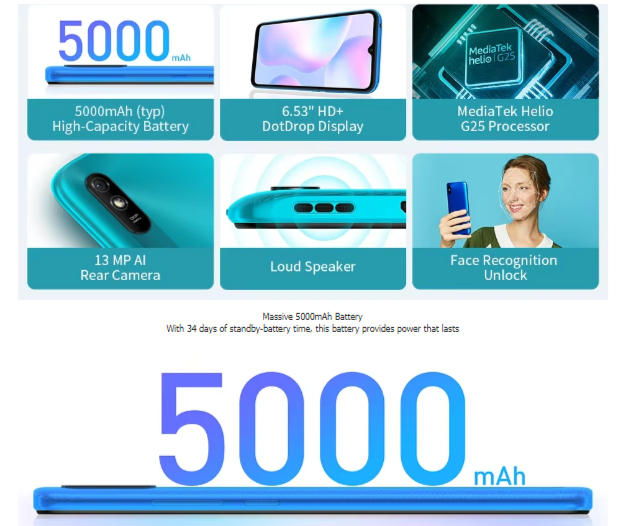 Xiaomi Redmi 9A - представник лінійки доступних смартфонів, який забезпечує комфортний рівень продуктивності в більшості повсякденних завдань. Пристрій виконаний в Безрамковий корпусі і поставляється в декількох яскравих кольорах. Xiaomi Redmi 9A має 6,53-дюймовий IPS дисплей з роздільною здатністю 1600х720 пікселів і співвідношенням сторін 20: 9. 8-ядерний процесор MediaTek Helio G25 дозволяє легко спілкуватися в Інтернеті, переглядати відео і грати в невимогливі ігри. Оперативної пам'яті в Xiaomi Redmi 9A встановлюється 6+2 ГБ, а для зберігання даних передбачений накопичувач на 128 ГБ. Основна камера смартфона має 13 МП сенсора, а фронтальна - 5 МП